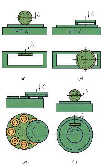 (1)臥軸矩臺(tái)式平面圓臺(tái)磨床(圖1a ) 在這種機(jī)床中,工件由矩形電磁工作臺(tái)吸住。砂輪作旋轉(zhuǎn)主運(yùn)動(dòng)n,工作臺(tái)作縱向往復(fù)運(yùn)動(dòng)f1 ,砂輪架作間歇的豎直切入運(yùn)動(dòng)f3和橫向進(jìn)給運(yùn)動(dòng)f2 。